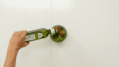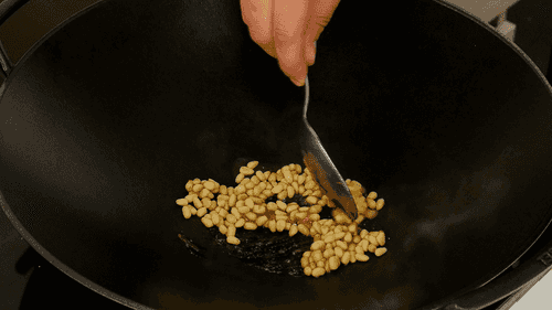 На вок вылить немного кленового сиропа и соуса кимчи, добавить кедровые орешки и обжарить в течение 10 секунд, затем добавить сок лайма. На блюдо к овощам выложить салат корн, посыпать кедровыми орешками.