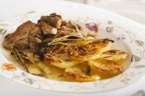 Выложить на тарелку томленого козленка с картофелем и овощами, украсить веточкой розмарина.