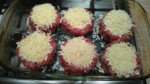 Выложить в каждую котлету по чуть-чуть жареного лука, картофеля, натертого яйца и сверху посыпать сыром.