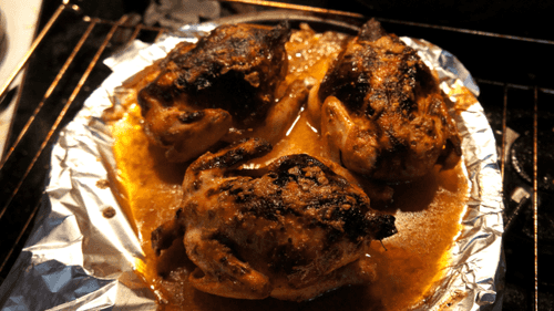 Смазать противень оставшимся оливковым маслом, во внутрь цыплят залить оставшийся маринад и готовить при 200 градусов 35-40 мин.