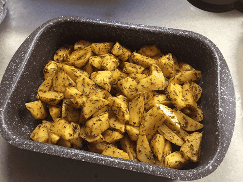Хорошо перемешать картофель со специями и маслом, дать постоять минут 20-30 под пищевой пленкой (если позволяет время).
