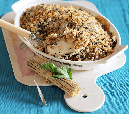 Смешать крошки с зеленью, добавить лимонный сок и немного оливкового масла.
