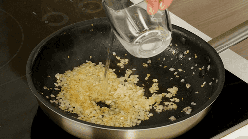 Нарезать лук мелким кубиком и обжарить на той же сковороде, добавить мелко нарезанный чеснок, 20 мл воды, потушить 2-3 минуты.