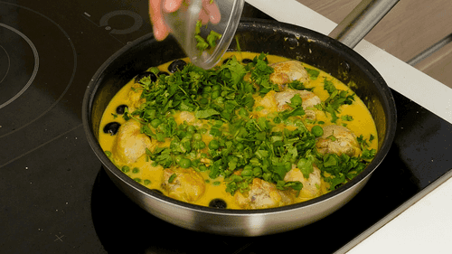 Добавить маслины, перевернуть ножки, накрыть крышкой и готовить еще 10 минут. Затем добавить горошек, готовить еще 3-4 минуты, накрыв крышкой. В конце добавить рубленную кинзу и снять с огня.