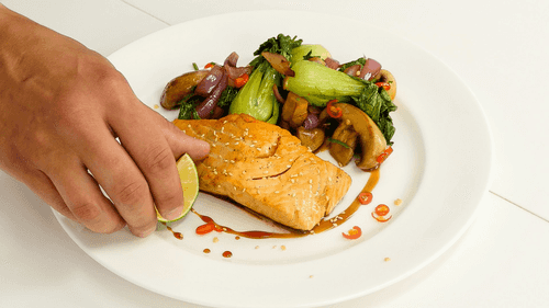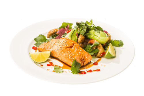 Стейк из лосося в паназиатском стиле — это гармония вкусов, сочетающая свежесть рыбы с пикантностью восточных специй. Лосось, обжаренный до золотистой корочки, приобретает насыщенный вкус благодаря карамелизированному соусу терияки с лаймом. Гарнир из пак-чоя, красного лука и шампиньонов придает блюду приятную текстуру и оттенок свежести, а кинза и острый перец чили добавляют яркости. Это блюдо — воплощение баланса между сладостью, кислинкой и легкой остротой. Оно идеально подходит как для праздничного ужина, так и для гастрономического удовольствия в будний день. Подача с кунжутом и свежими травами делает его не только восхитительным на вкус, но и изысканным на вид.
