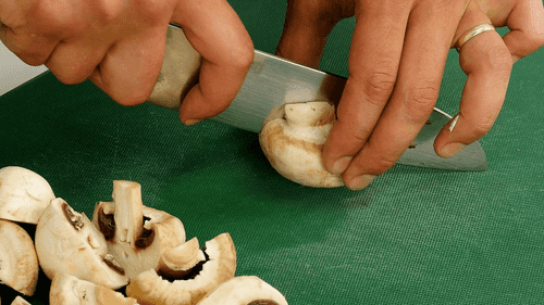 Подготовить овощи: разрезать шампиньоны пополам, красный лук нарезать крупной соломкой, порубить кинзу, чили нарезать колечками, пак-чой рабобрать на листья, отрезав кочерыжку.