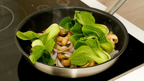 В другой сковороде разогреть оливковое масло, обжарить грибы в течение 15 секунд, добавить лук и чили, обжаривать минуту. Добавить пак-чой и терияки, посолить, припустить в течение 15 секунд, снять с огня и добавить кинзу.
