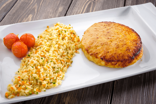 Взбить фарш и сформовать котлету в виде лепешки. Обжарить на растительном масле (20 мл) с двух сторон и довести до готовности в духовке при температуре 180°С в течение 20 минут.