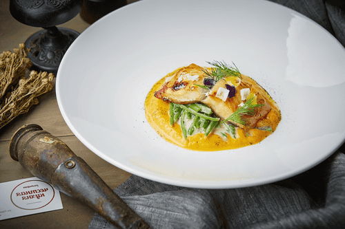 Подкопченный беломорский палтус с хрустящим салатом из фасоли и пряным тыквенным кремом