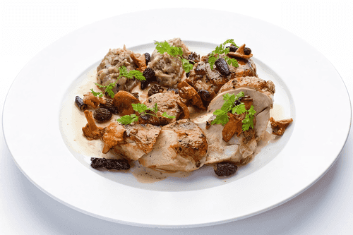 Цыпленок с лесными грибами и воздушным картофелем с трюфелями