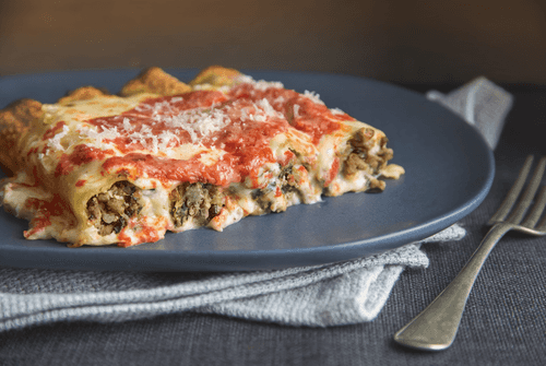 Каннеллони с белой мясной начинкой под красным соусом
