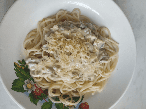 Паста с грибами и колбасой в сливочном соусе