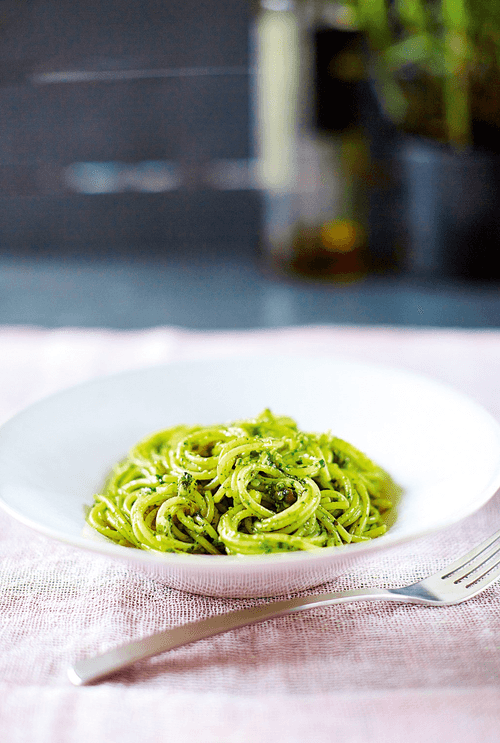Отварить спагетти в большом количестве кипящей подсоленной воды до полуготовности (в течение 60–70% от времени, указанного на упаковке). Тем временем прогреть масляно-чесночную смесь и добавить столовую ложку песто.