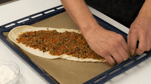 Раскатать кусок теста в длинный тонкий пласт, переложить его на противень с пекарской бумагой. Выложить на тесто восьмую часть фарша тонким слоем, отступая от краев на 2–3 см.