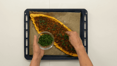 Готовые пиде посыпать петрушкой и разрезать поперек.