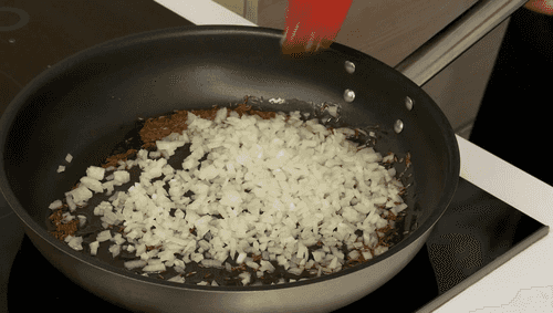 После чего добавить фарш и жарить 10–15 минут. Добавить томатную пасту, черный перец, хлопья чили, сахар и соль по вкусу, жарить еще 2–3 минуты. Затем снять с огня и добавить в фарш половину рубленой петрушки.