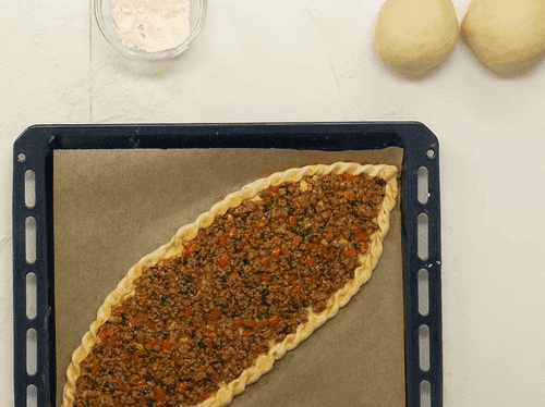 Подогнуть края теста, а концы пиде слепить так, чтобы получился пирог в форме длинной лодочки.