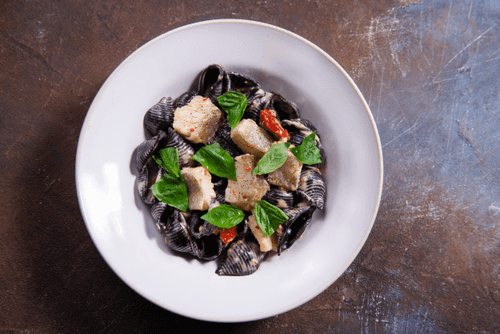 Выложить пасту в тарелку, украсить листьями рваного базилика и посыпать перцем.