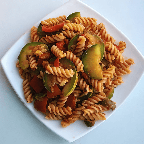 Паста с кабачками и перцем в томатном соусе — это яркое и ароматное блюдо итальянской кухни, которое гармонично сочетает свежие овощи, пряные специи и нежную текстуру фузилли. Родом из солнечной Италии, оно напоминает уютные семейные ужины, наполненные теплом и вкусом Средиземноморья. Кабачок придаёт легкость, сладкий перец — пикантность, а томатный соус — насыщенность и кисло-сладкий оттенок. Оливки добавляют приятную солоноватую нотку, а свежий розмарин раскрывает пряные ароматные аккорды. Это блюдо идеально подходит как для повседневного ужина, так и для особенного случая, ведь его цветовая палитра и богатый вкус создают атмосферу праздника. Легкость приготовления делает его отличным выбором для тех, кто ценит вкусные и полезные блюда без лишних хлопот.