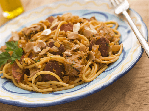 Макарони с чоризо и помидорами