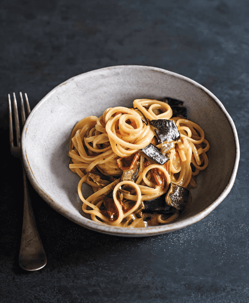 Добавить 350 мл воды от варки пасты и варить соус до легкого загустения, 4–5 минут. Удалить и выбросить чеснок.
