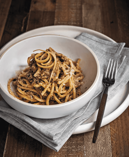 Эта питательная паста станет отличным выбором для насыщенных осенних и зимних обедов. В центре соуса располагается телячья голяшка, известная также как оссобуко, которую необходимо тушить на протяжении 14 часов. Рецепт был заимствован из кулинарной книги Марка Ветри «Готовим пасту».