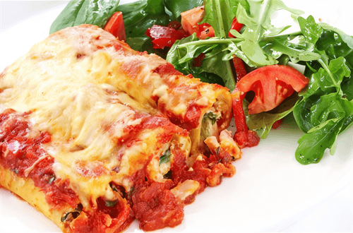 Если вы используете готовые каннеллони, то следуйте инструкции по приготовлению на упаковке (лучше выбирать те, которые не требуют предварительного приготовления — если вам попались именно такие, то хорошо слейте воду, прежде чем начинять их). Если вы используете листочки пасты — то просто разложите их на столе и заверните внутрь начинку. Каннеллони можно начинить с помощью чайной ложки с собственного мизинца. Уложите получившиеся фаршированные трубочки в огнеупорную посуду.