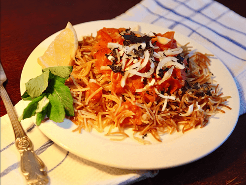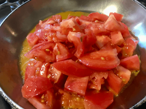 Жареные макароны с томлеными помидорами