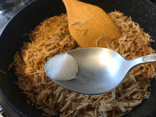 Влить стакан воды и мешать, не давая макаронам слипнуться.