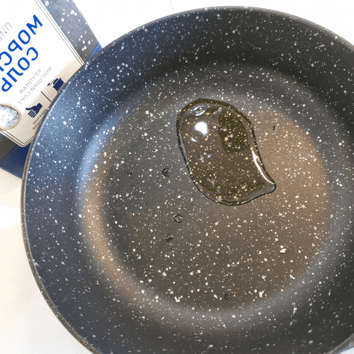 В сковороде разогреть масло с 1 щепоткой крупной соли.