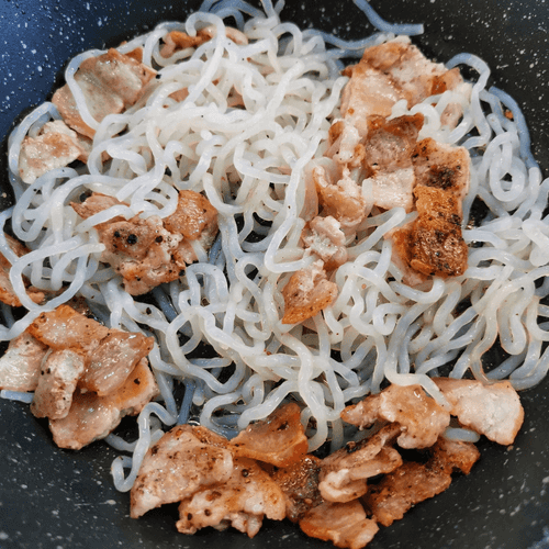 Выложить лапшу на сковороду и перемешать. Усилить огонь.