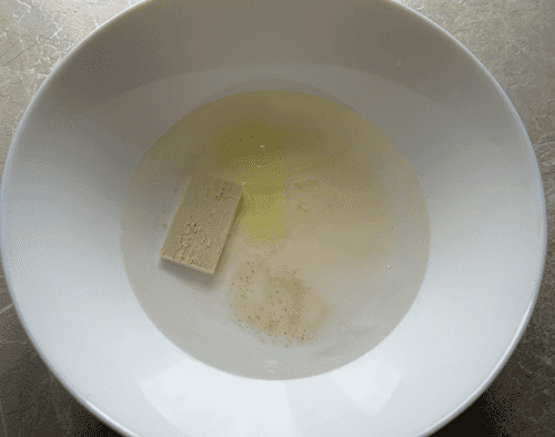 В миску отправить воду, дрожжи, соль, сахар, белок.