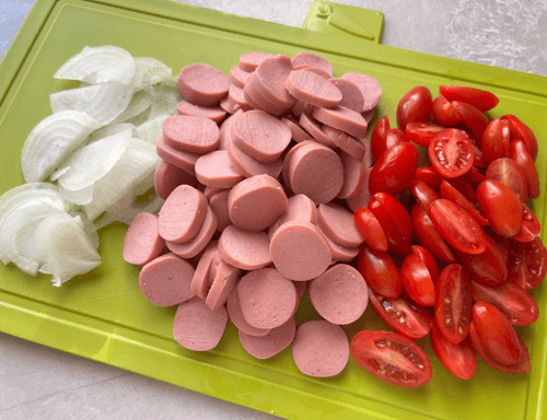 Помидоры, сосиски и лук нарезать.