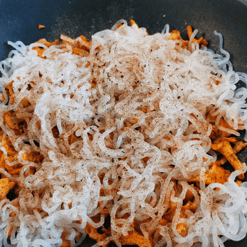 Добавить спагетти к грибам и поперчить. Перемешать.