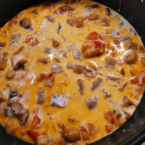 Как только сливки начнут густеть, добавить спагетти ширатаки и тщательно перемешать.