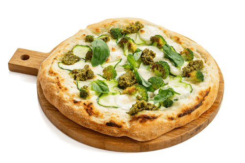 Пицца из разряда «белых», то есть таких, где лепешку не покрывает томатный соус, а используется только сыр — натертый в соус или сам по себе. Хотя уместнее было бы называть ее «зеленой», поскольку и брокколи, и цукини зимой и летом радуют нас своим бодрым хрустом и салатным цветом, что позволяет создать иллюзию овощного изобилия, даже когда метут снега. Цукини лучше нарезать очень тонко, а вот с брокколи не нужно мельчить, желательно разобрать ее на довольно крупные соцветия для красоты и контраста с бархатной текстурой растопленного в сливках пармезана.