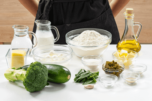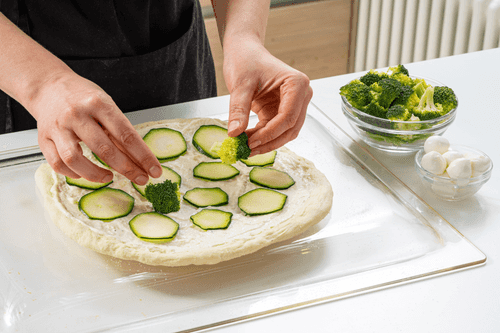 На тесто выложить сливочный соус, брокколи, цукини. Поверх овощей выложить шарики моцареллы. Выпекать пиццу 5–10 минут при 230 градусах, до аппетитной румяности.
