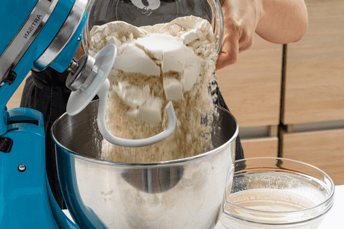 Вмешать оставшуюся муку и вымесить тесто. Тесто можно вымешивать вручную или стационарным миксером с насадкой крюк.