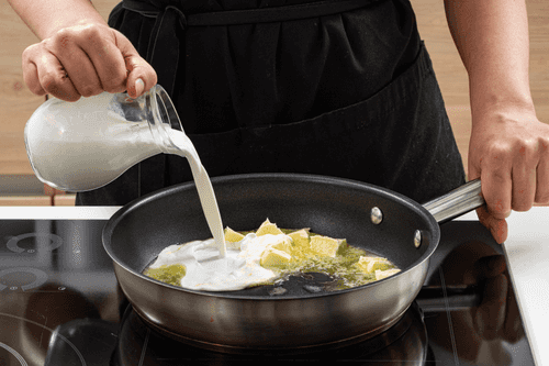 Для соуса прогреть сливочное масло в сковороде вместе со сливками. Тушить несколько минут на медленном огне.