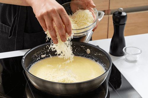 Добавить в соус натертый пармезан и чеснок, пропущенный через пресс. Полностью растопить сыр, посолить, поперчить и снять с огня.