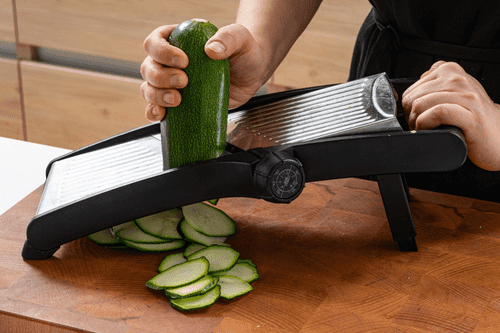 Цукини нарезать тонкими слайсами. Если цукини крупный, предварительно разрезать его пополам вдоль.