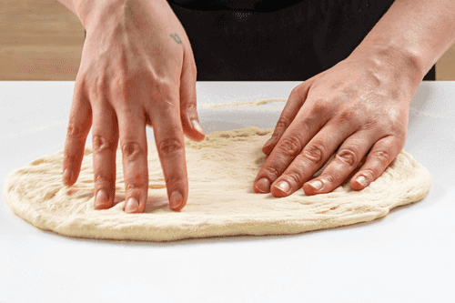 Из готового теста сформировать лепешки вручную, растягивая пальцами тесто от центра к краям.