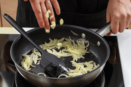 Разогреть в сковороде оливковое масло и обжарить на нем лук до прозрачности. Добавить чеснок.