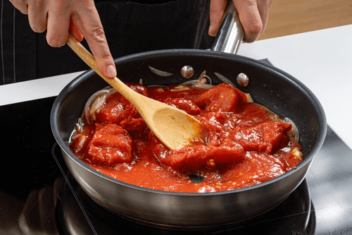 Положить в сковороду помидоры вместе с соком. Размять их лопаткой.