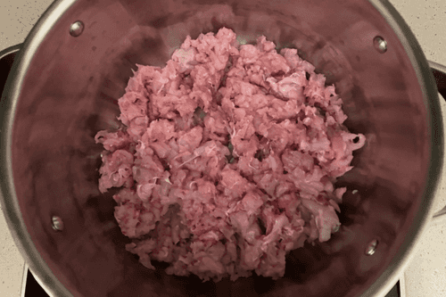 Кастрюлю с толстым дном или сотейник поставить на плиту на средний огонь, положить в нее мясо и обжарить в течение 5 минут. При жарке мясо помешивать.