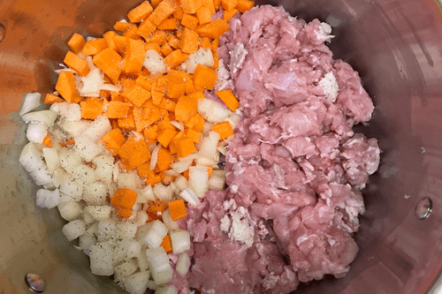 Добавить к мясу лук, морковь и обжарить в течение 15 минут (помешивать при жарке).