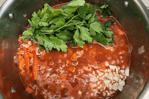 Добавить томатный соус, чеснок, перец, петрушку и тушить в течение 30 минут.
