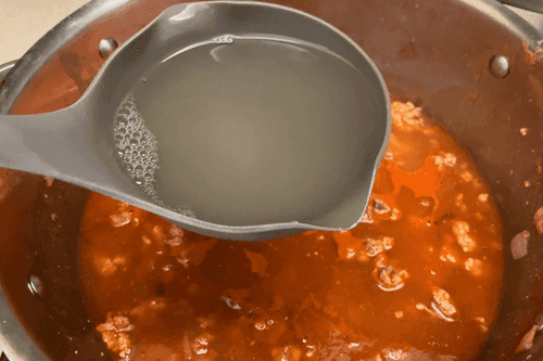 Удалить петрушку и острый перец, Добавить воду, в которой варилась паста, соль, специи, и размешать.