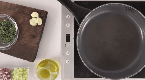 Подогрейте масло в глубокой кастрюльке с широким дном, добавьте мелко нарезанные овощи, травы и целые зубчики чеснока и пожарьте при высокой температуре пять-восемь минут, помешивая.