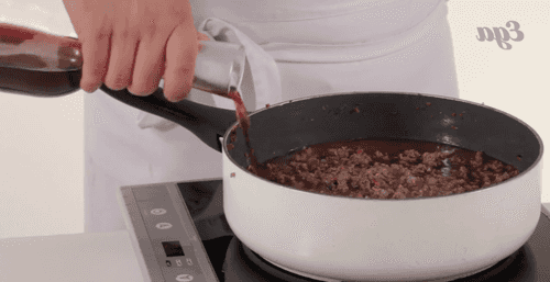 После чего добавьте вино, перемешайте содержимое кастрюли и варите, пока вино практически полностью не выпарится. Не забывайте помешивать фарш и овощи время от времени.